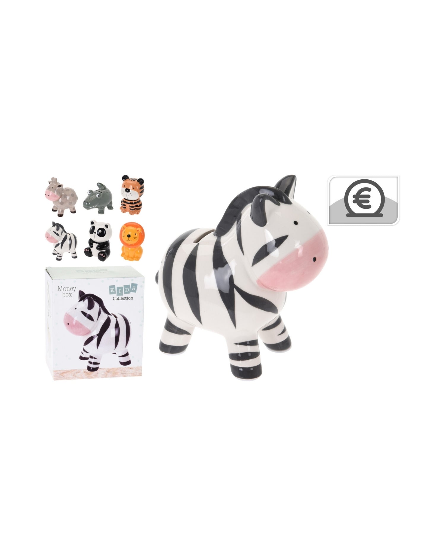 Sparebøsse dyr forskellig størrelse, men alle omkring 18x18x10 cm - Vælg mellem 6 design  krokodille / panda / giraf / løve / tiger / zebra