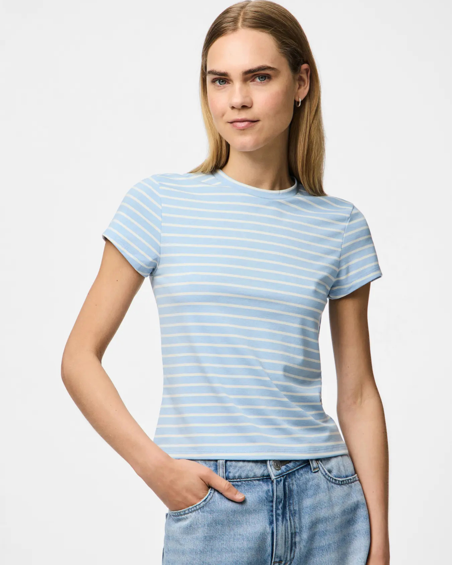 Lyseblå t-shirt med hvide striber fra Pieces.