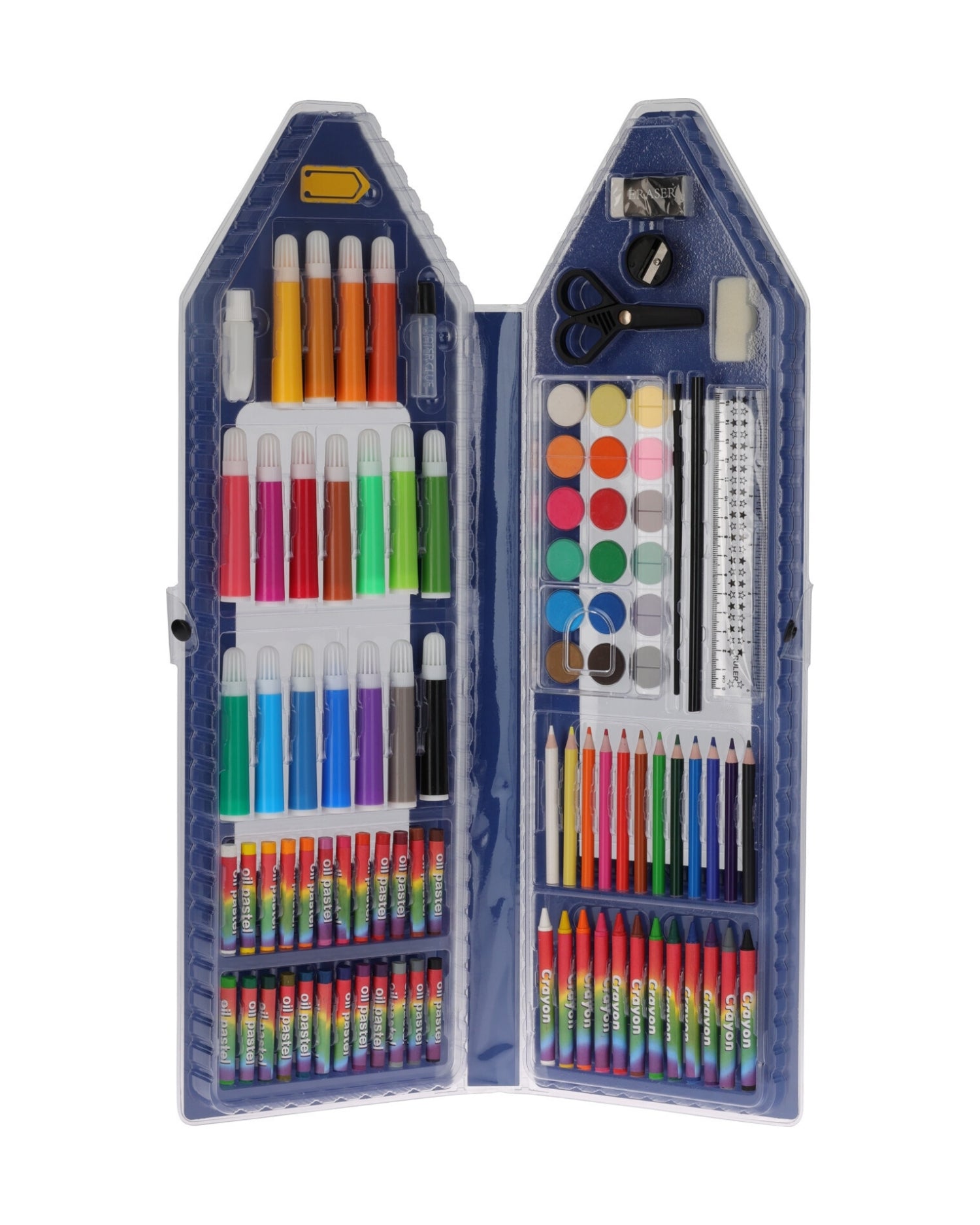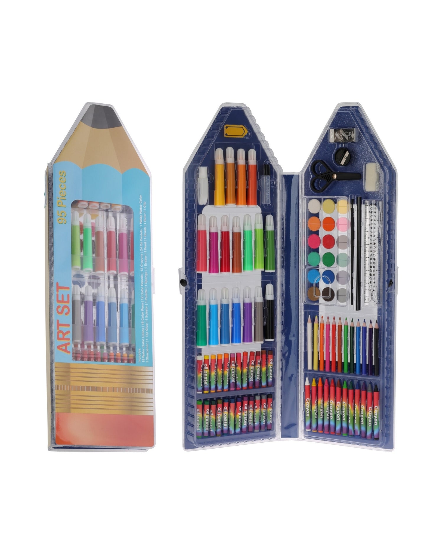 Kunstsæt tegn og mal med 95 dele - Æskens størrelse 29,2x13,1x3,9 - Indeholder 18 farvelader / 12 minifarveblyanter / 24 oliekridt / 18 mini farver / 12 farveblyanter / 1 spidser / 1 lim / 1 palet / 1 svamp / 1 viskelæder / 1 blyant / 1 pensel / 1 klips