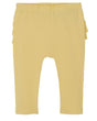Fine Name It leggings i gul. Bagpå er der tre brede blonder i toppen. Leggingsene har en god elastikkant i taljen, som sikrer en god pasform. I benåbningerne er der smalle ribkanter og leggingsene er i en lækker og strækbar bomuldskvalitet.