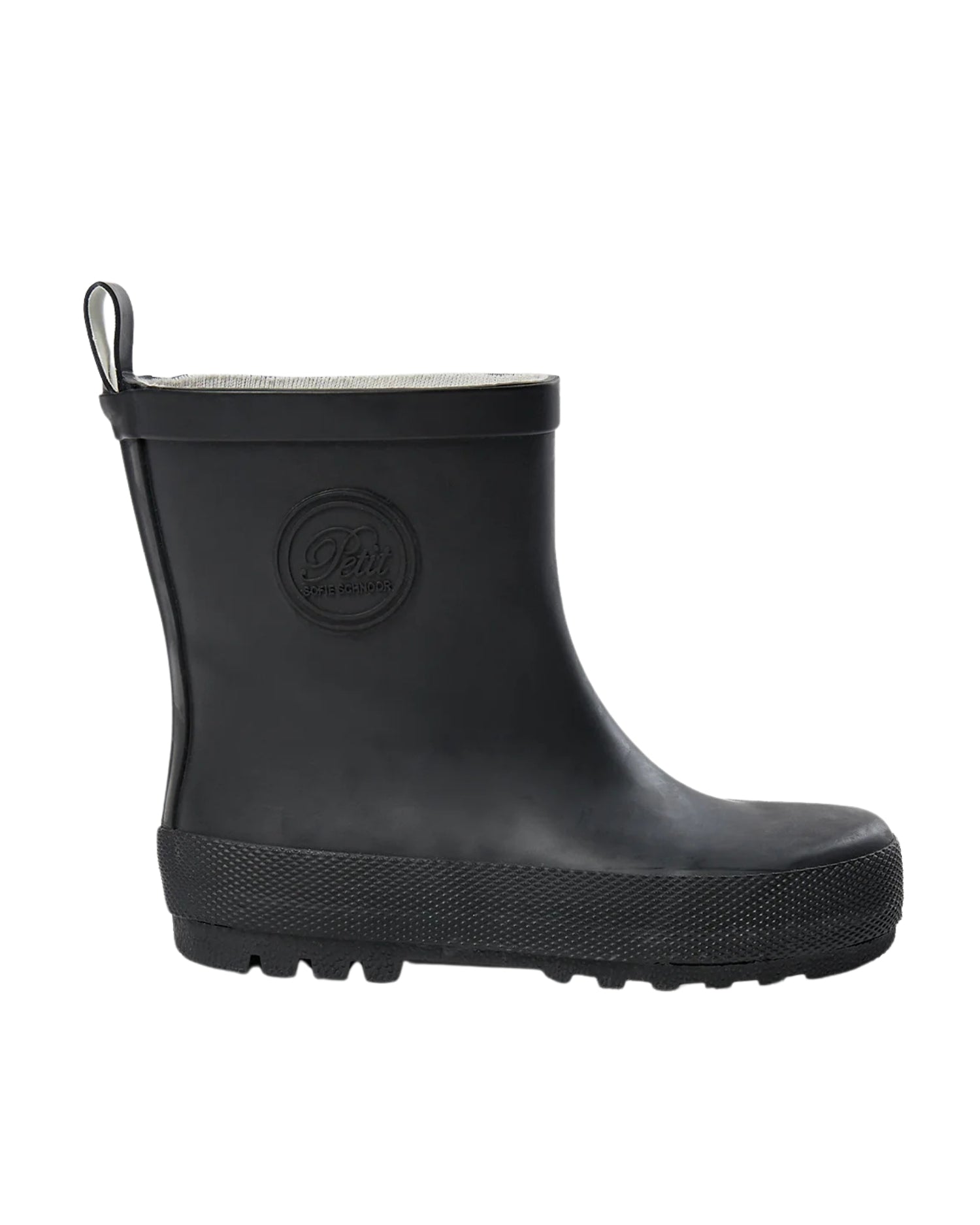 Fin Klassisk gummistøvle fra Sofie Schnoor med for. Gummistøvler i sort med logo på ydersiden. Gummistøvlerne har riller i bunden, som sikre et bedre fodfæste i det våde vejr. Designet med et lavt skaft.