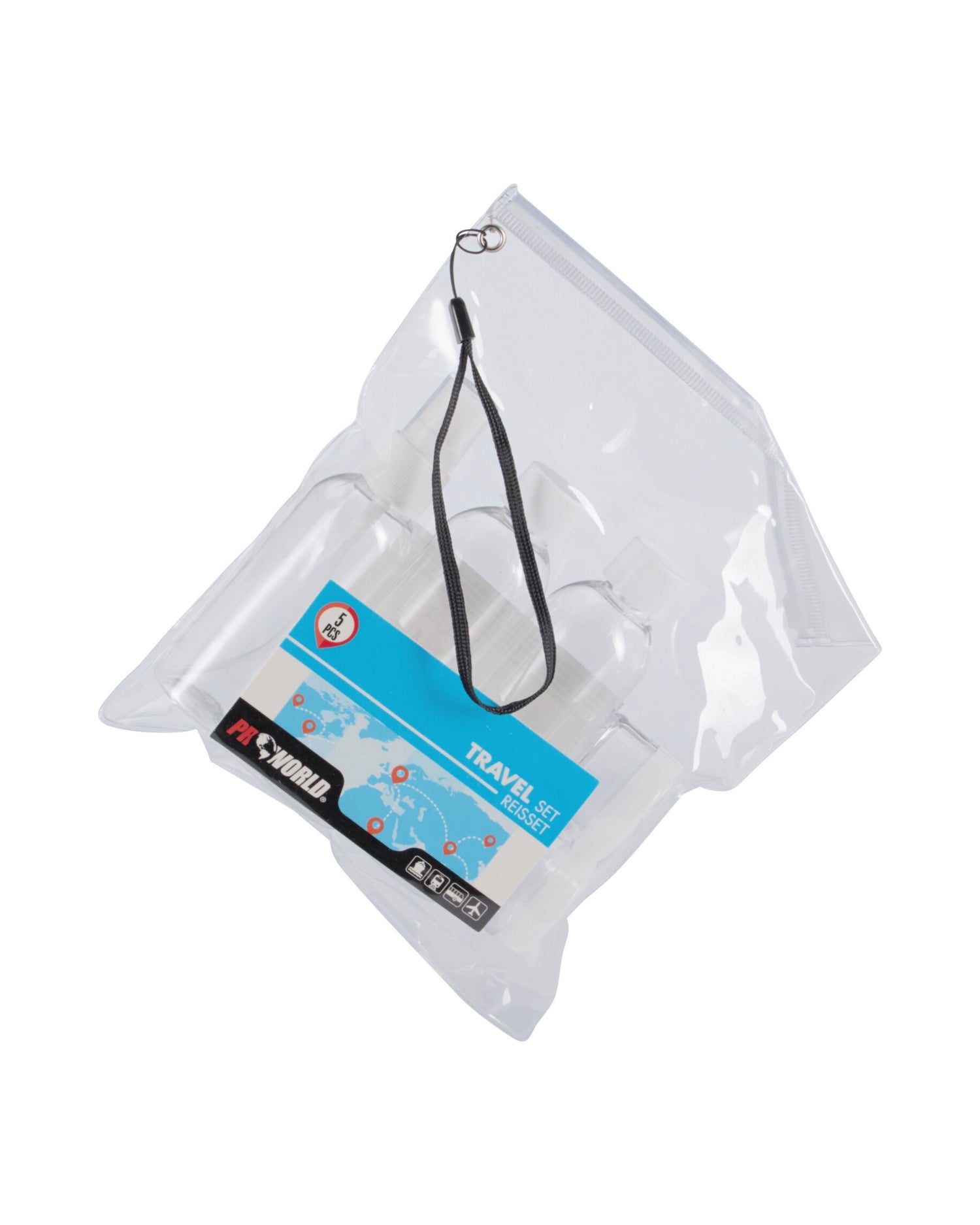 Leveres med indsætningsetiket i transparent acetatpose med lynlås og snor, som gør sættet nemt at opbevare og tage med i håndbagagen. Ideelt til rejser, weekendture og fitness.