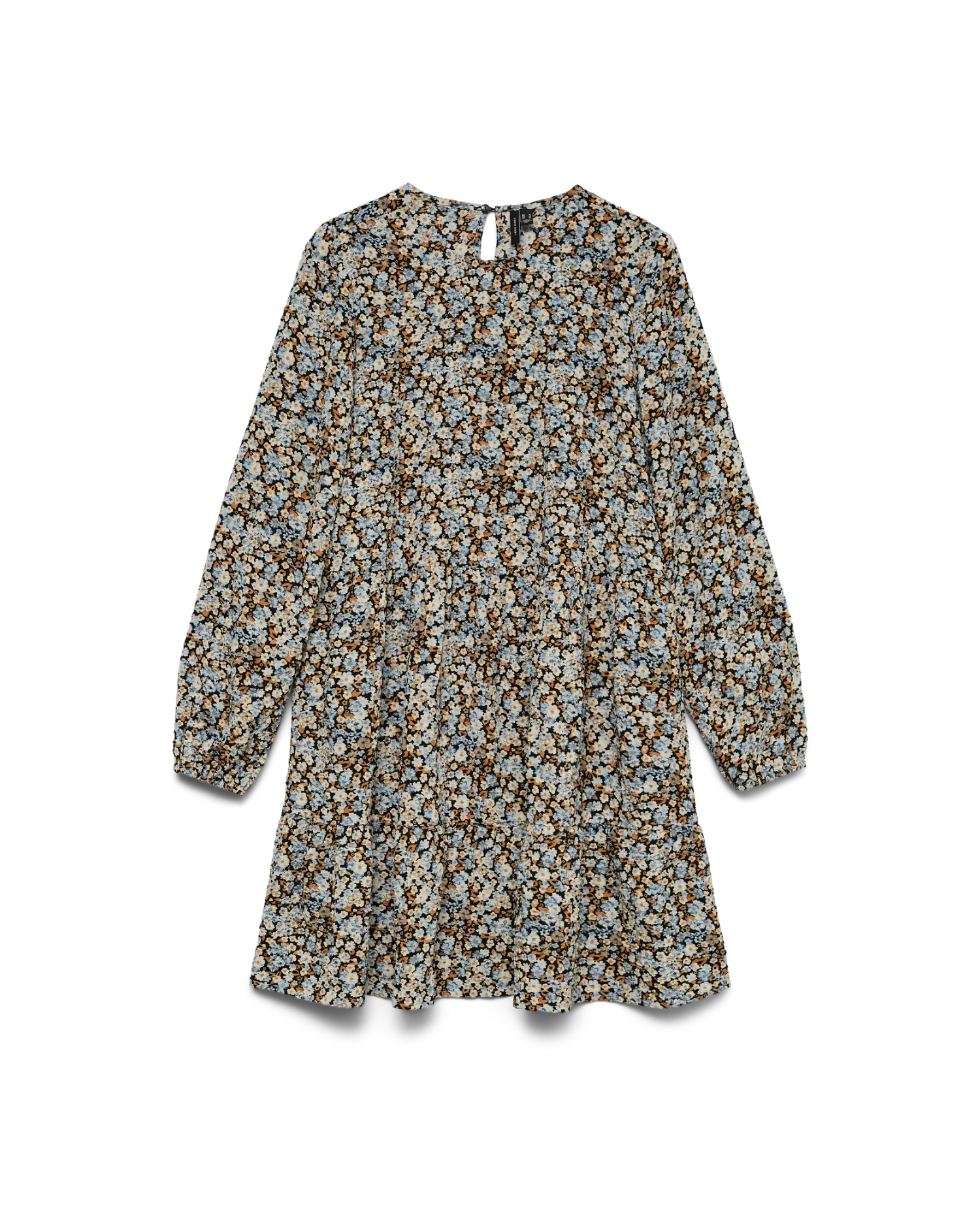 Fin sort kjole med lange ærmer og brune, hvide og blå blomster fra Vero Moda.